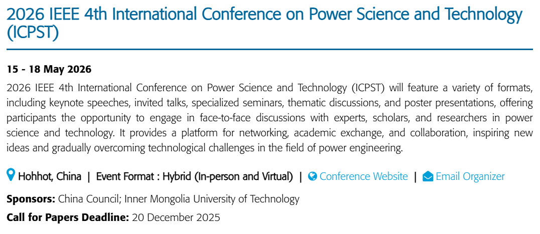 To provide an important platform for academic exchange and sharing of research achievements in the global power engineering field, 2026 IEEE 4th International Conference on Power Science and Technology (ICPST) will be held from May 15 to 18, 2026, in Hohhot, Inner Mongolia, China. The conference is sponsored by Inner Mongol University of Technology, IEEE, hosted by College of Electric Power, Inner Mongol University of Technology, Engineering Research Center of Large Energy Storage Technology, co-hosted by School of Electrical Power Engineering, Kunming University of Science and Technology, patrons with Huazhong University of Science and Technology, Shanghai Jiao Tong University, Northeast Electric Power University, Guizhou University, and Test Department of Electric Power Dispatch Automation System and Equipment (Nanjing)-China Electric Power Research Institute, China Southern Power Grid, Yunnan International Co., LED, IEEE PES China WIP, China Electric Power Research Institute, media supports from Journal of Protection and Control of Modern Power System (PCMP), Journal of Power System Protection and Control, Journal of Electric Power Construction (EPC), Proceedings of the CSEE, Journal of Power System Technology, Journal of High Voltage Engineering, Journal of Electric Power Information and Communication Technology, CESS Journal of Power and Energy Systems, Journal of High Voltage, Journal of New Type Power Systems, Journal of Information Processing in Agriculture (INPA), Journal of Global Energy Interconnection, Journal of Thermal Power Generation, Journal of Power Generation Technology, Journal of Electric Power, Journal of Automation of Electric Power Systems, Journal of Modern Power Systems and Clean Energy, Journal of Southern Power Grid Technology, Journal of Integrated Intelligent Energy, Journal of Electrical Measurement and Instrumentation, Shandong Electric Power, Distribution & Utilization.